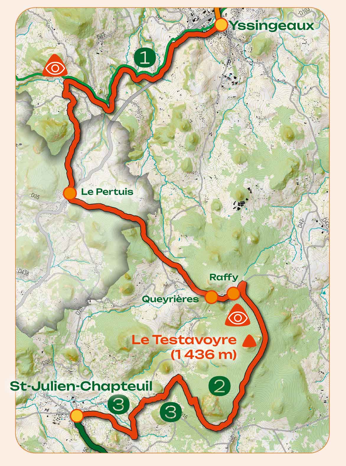 Au départ du parking de l'Antreuil, la mise en jambes se fait en douceur sur la Via Fluvia, idéale pour chauffer les mollets. Puis le parcours prend de la hauteur entre les Sucs, ces volcans emblématiques des montagnes de Haute-Loire, et dévoile des panoramas qui s’ouvrent généreusement. La montée vous entraîne jusqu’au Testavoyre, sommet du massif du Meygal. La descente vers la belle cité capitolienne vous réserve la découverte d’un patrimoine traditionnel remarquable.