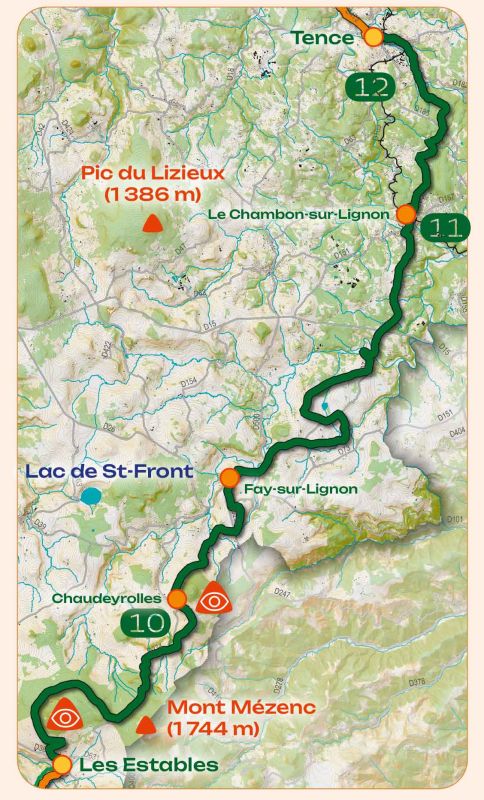 Traversée de Chaudeyrolles entre les narces volcaniques et le mont Signon, ancienne carrière de lauze, et vous entrez dans les plateaux du Haut-Lignon, avec en ligne de mire le Pic du Lizieux (1 388 m), autre sommet emblématique de Montanha ! Une halte s’impose à la petite station du Chambon-sur-Lignon, avant de rejoindre Tence au travers de forêts profondes et fraîches.